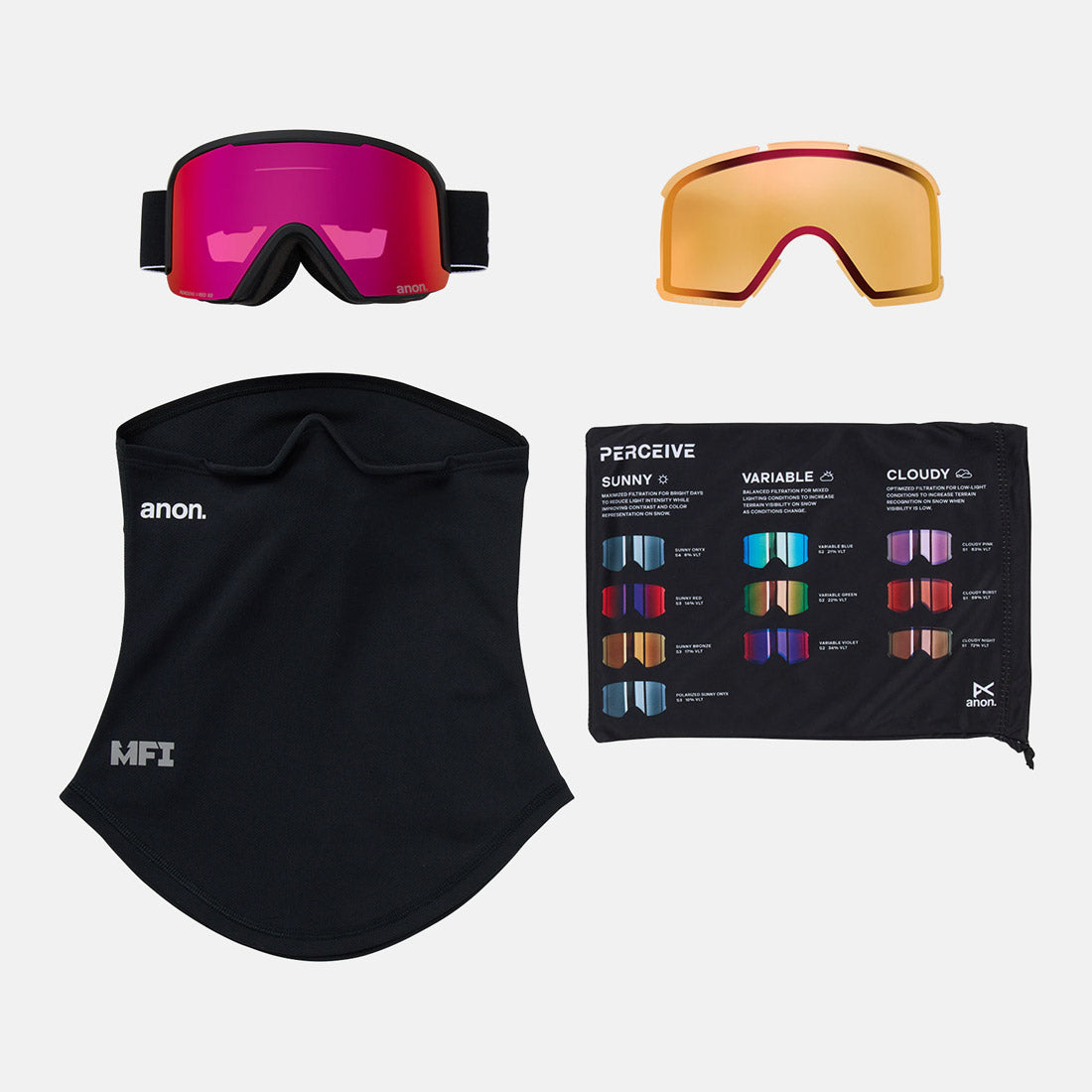 The Anon Nesa Goggles combine a sleek, modern profile with a wide field of view and the clarity of Perceive lens technology. A cylindrical lens and semi-frameless design maximize the field of view, while Perceive lens technology enhances contrast for the best possible definition and terrain recognition. They feature our exclusive magnetic face mask integration (MFI®) for seamless coverage from snow, wind, and sun when used with our compatible hoods and face masks. They are over the glass compatible for wearing with eyeglasses and include two Perceive lenses, a mesh MFI face mask, plus a microfiber bag for storage and lens cleaning.