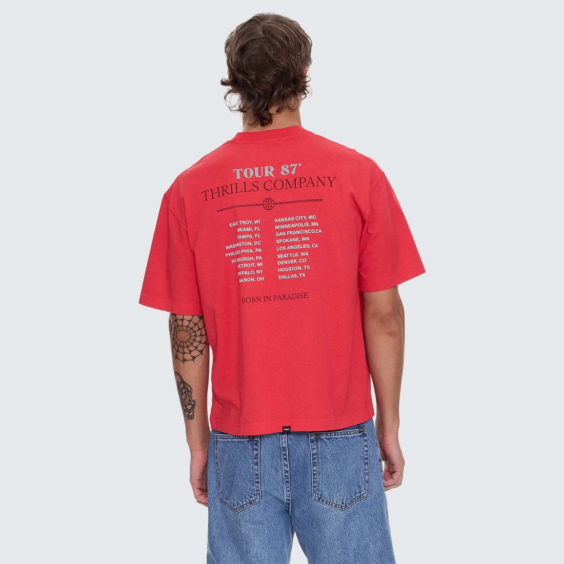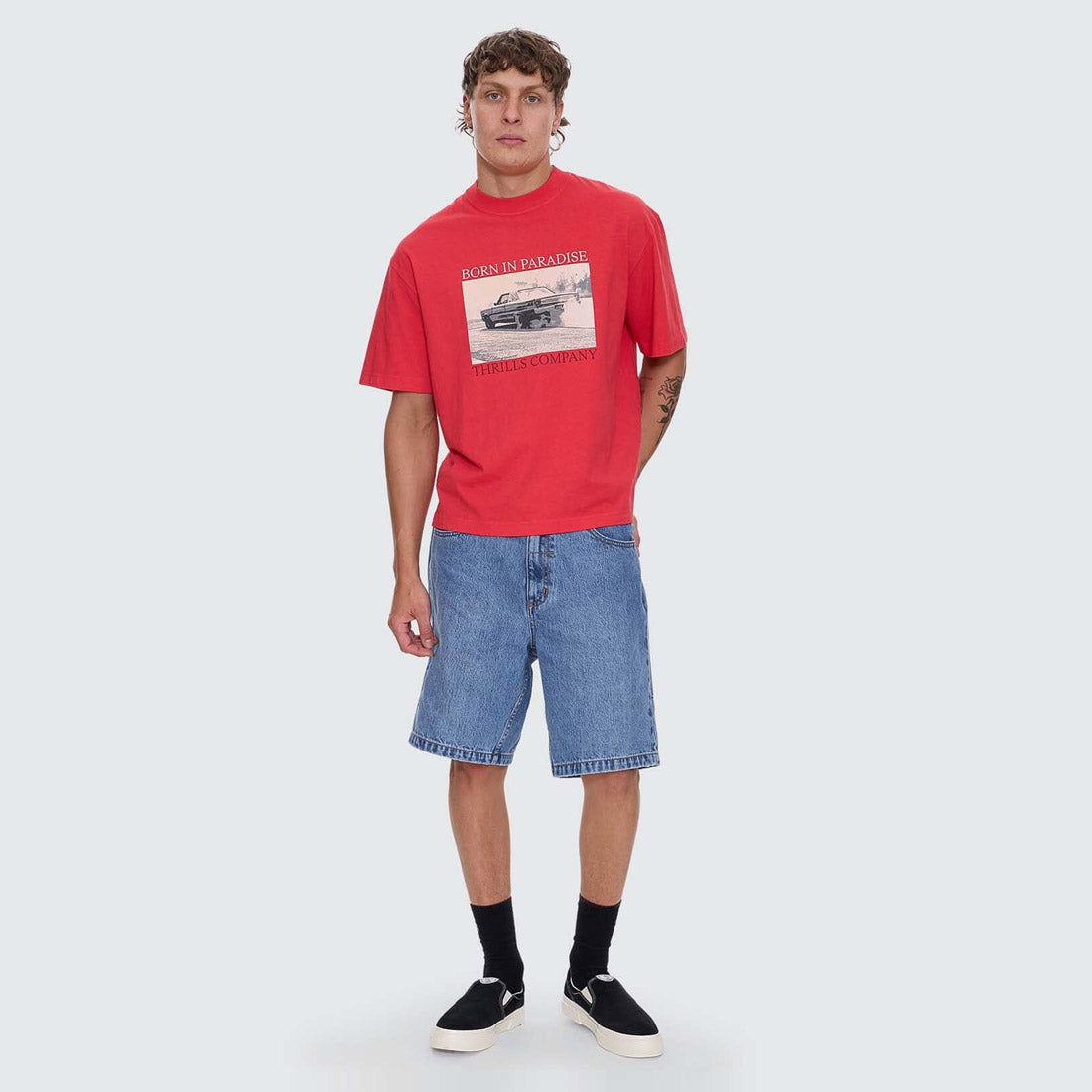 Make a statement with the Metal and Dust Oversize Cropped Tee in Flame Red. Cut from midweight cotton dry hand jersey, this organic cotton tee staple is lightweight yet structured, holding its boxy, cropped silhouette with ease. The oversized, shorter fit adds relaxed width, while the bold front graphic brings that raw, street-inspired edge Thrills is known for. Perfect as a streetwear t-shirt for summer, this tee is versatile, easy to wear with slacker baggy denim jeans or relaxed shorts for that effortless, summer style.
