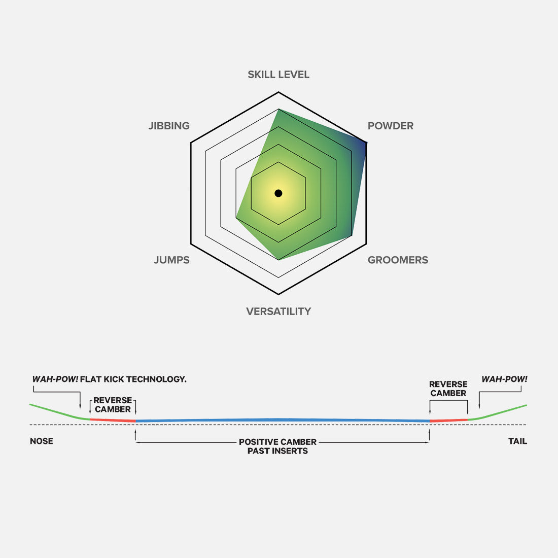 This revolutionary all-terrain shape provides the best of both worlds. It has a raised camber platform through the inserts to retain high-speed edge hold through variable terrain, elevated contact points to land and float in powder, and Flat Kick tip and tail arcs for faster, more aggressive transitions.