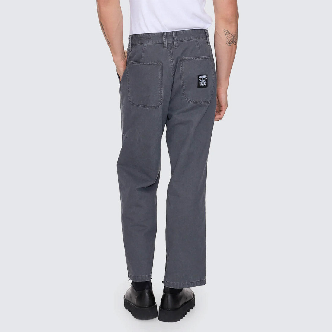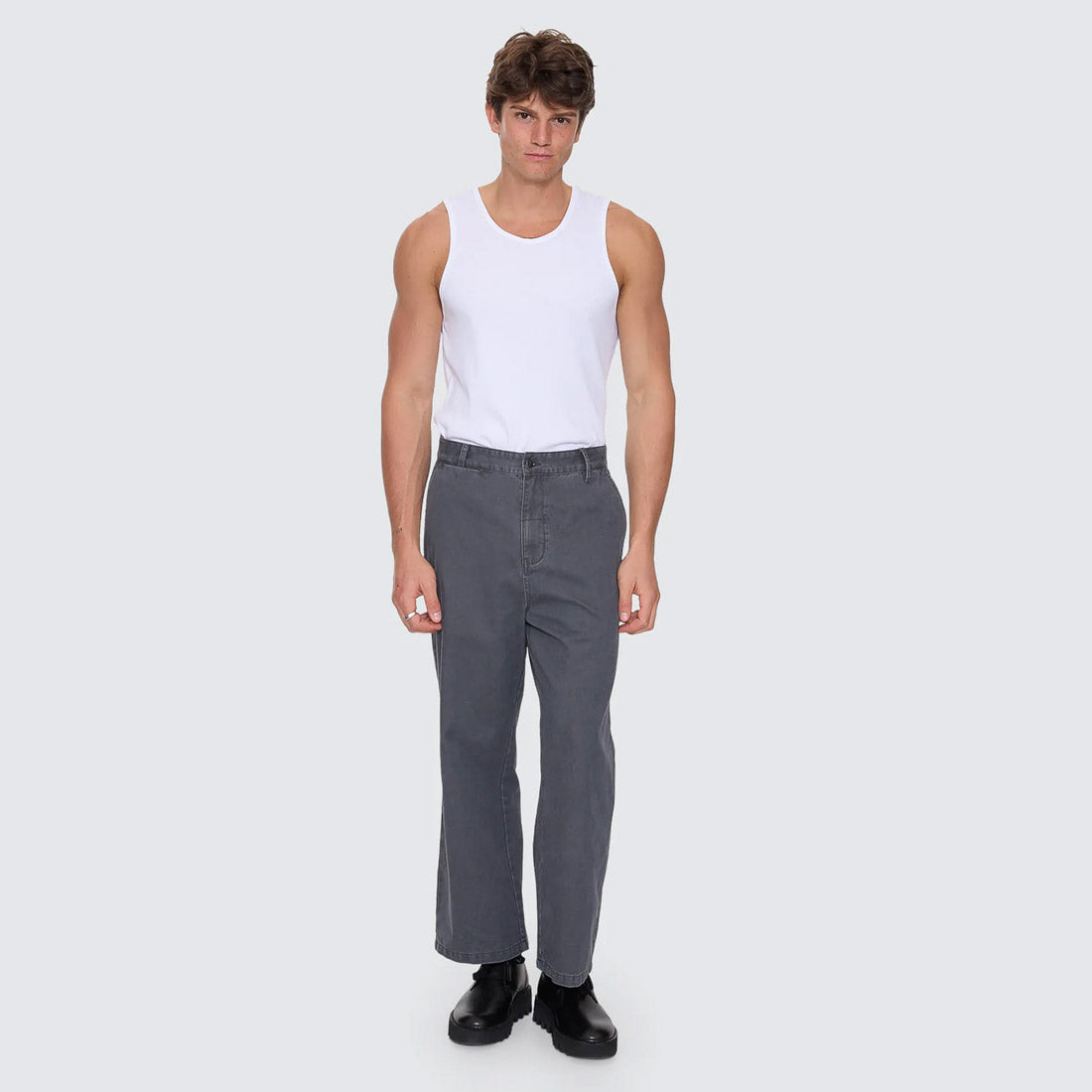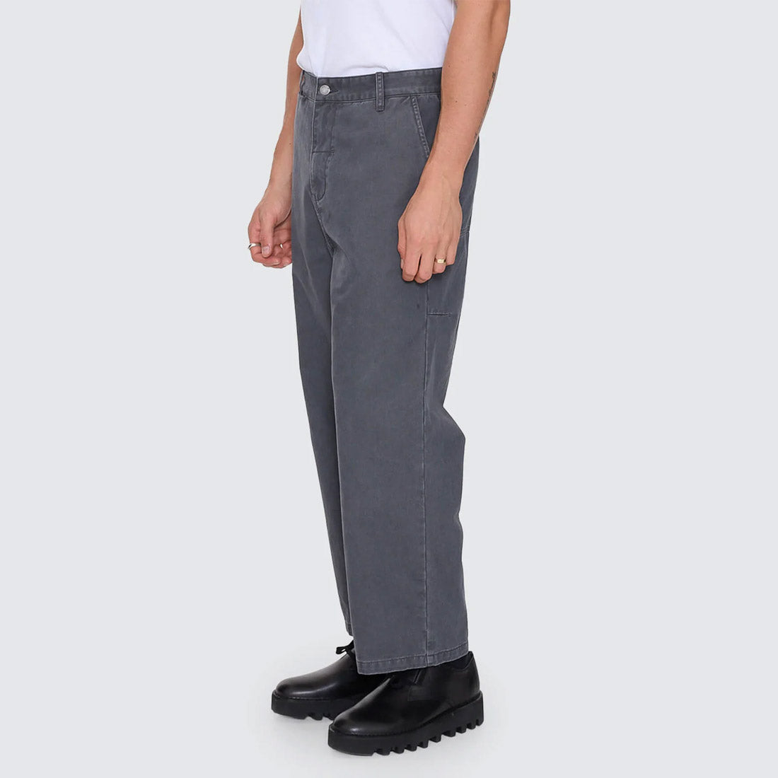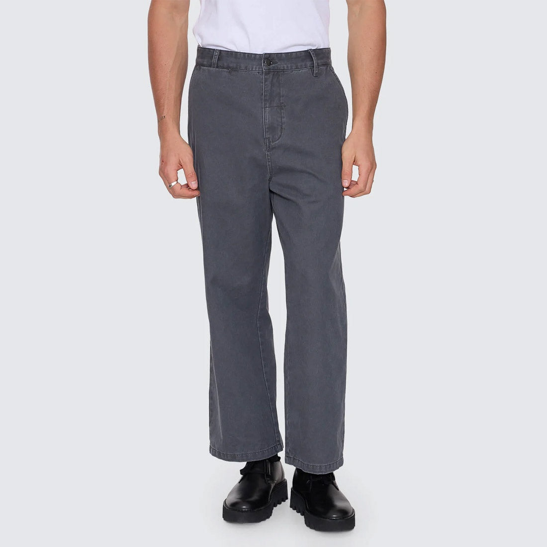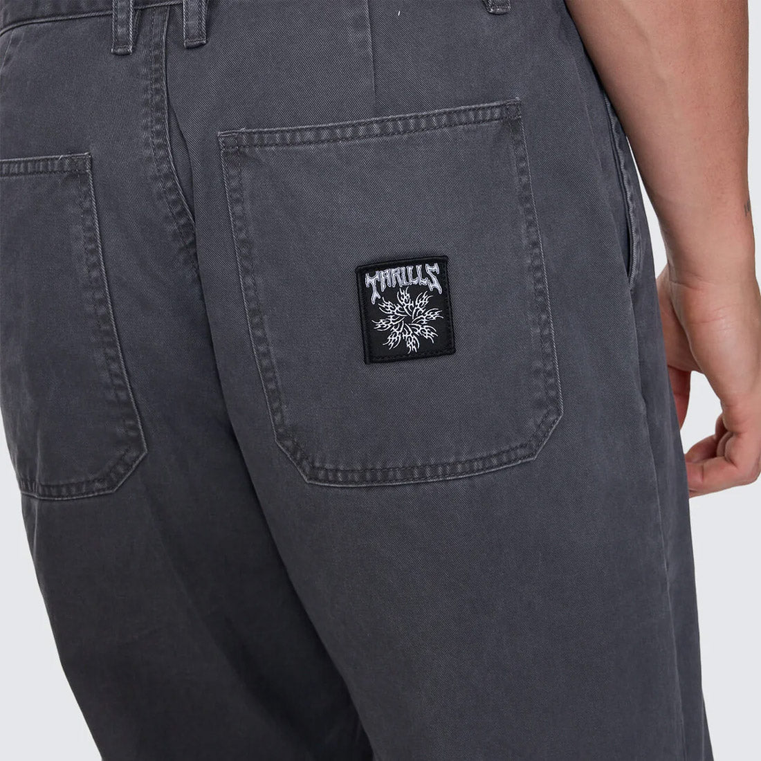 Easygoing shape meets sharp execution in the Stagger Big Slacker Cropped Pant in Dark Charcoal. Finished in a sleek, dark wash, these cotton sateen chino pants feature a relaxed, worn-in feel while keeping the look clean and considered. The cropped leg and roomy fit give it a slacker attitude, balanced by tailored details like belt loops, a zip and button closure, and neat welt pockets. Built for everyday wear, from workday to weekend, this men's clothing staple brings effortless Thrills energy to your rotation.