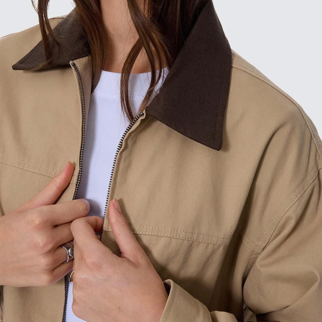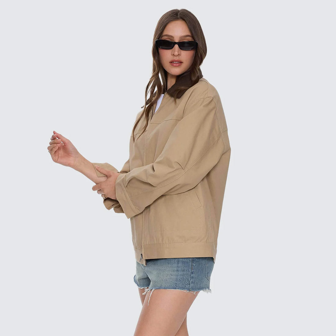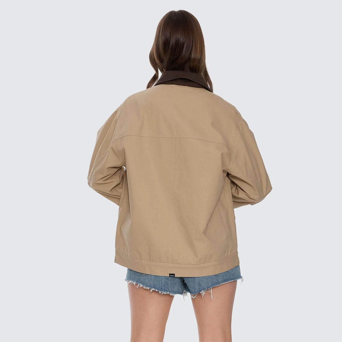 Built for layering and street-ready movement, the Robbie Chore Jacket in Camel blends classic workwear with a modern edge. Cut from durable cotton and fully lined for comfort, it features a clean zip front, panelled construction, and roomy patch pockets that keep things practical and stylish. The contrast collar adds texture, while the versatile colourway makes this an all-around favourite. Easy to throw over tees, knits, or dresses, this chore jacket for women is a definite buy.