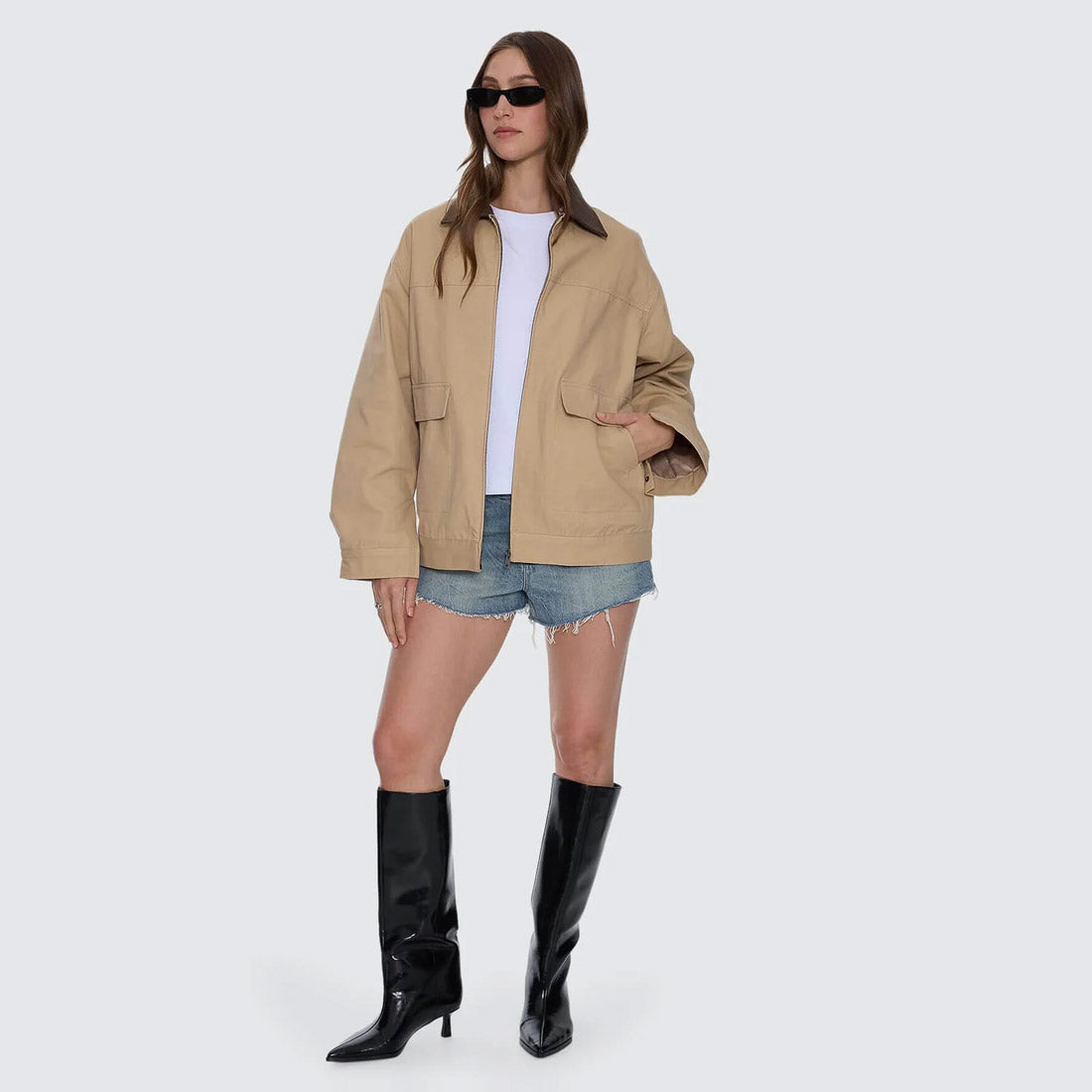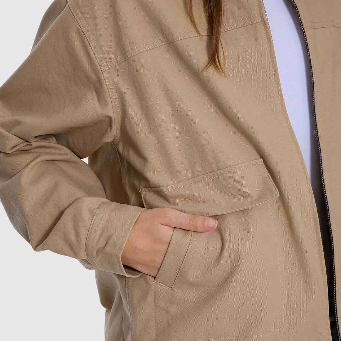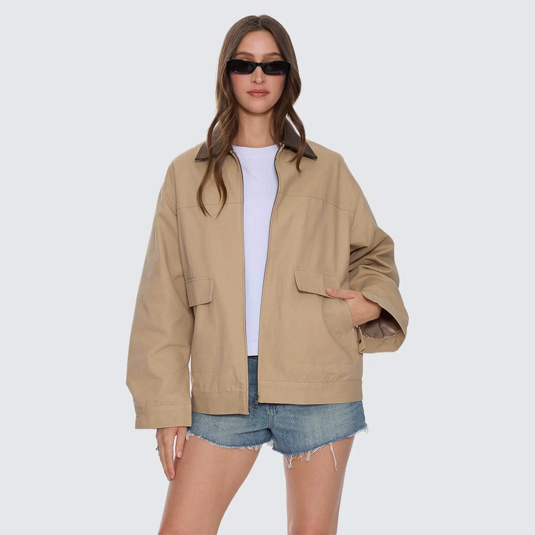 Built for layering and street-ready movement, the Robbie Chore Jacket in Camel blends classic workwear with a modern edge. Cut from durable cotton and fully lined for comfort, it features a clean zip front, panelled construction, and roomy patch pockets that keep things practical and stylish. The contrast collar adds texture, while the versatile colourway makes this an all-around favourite. Easy to throw over tees, knits, or dresses, this chore jacket for women is a definite buy.