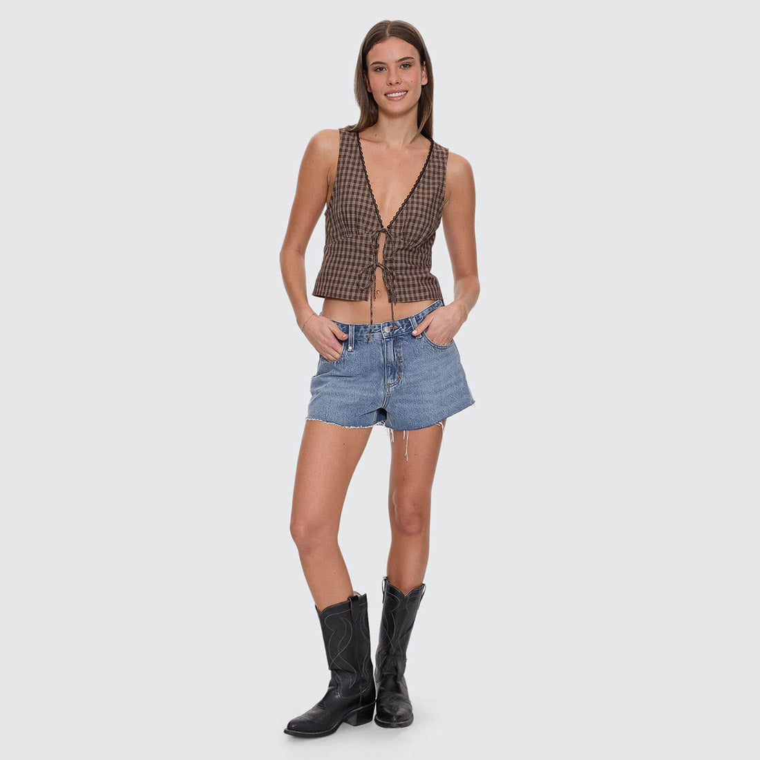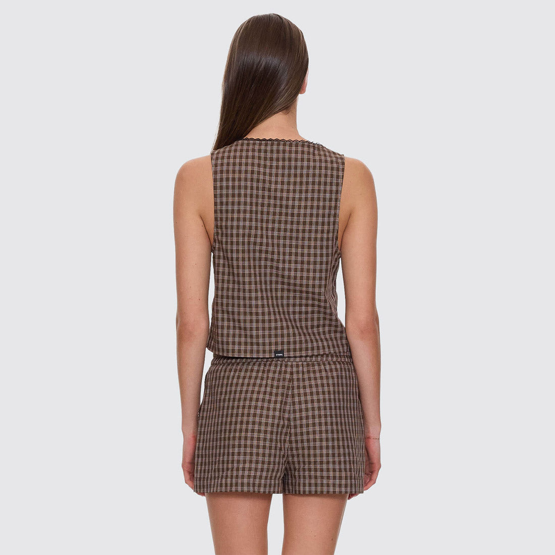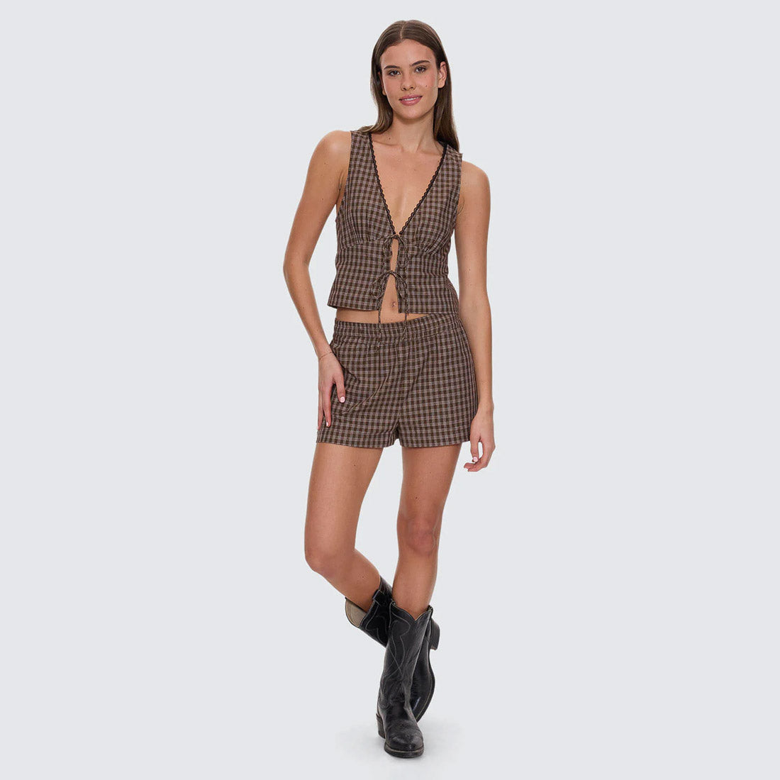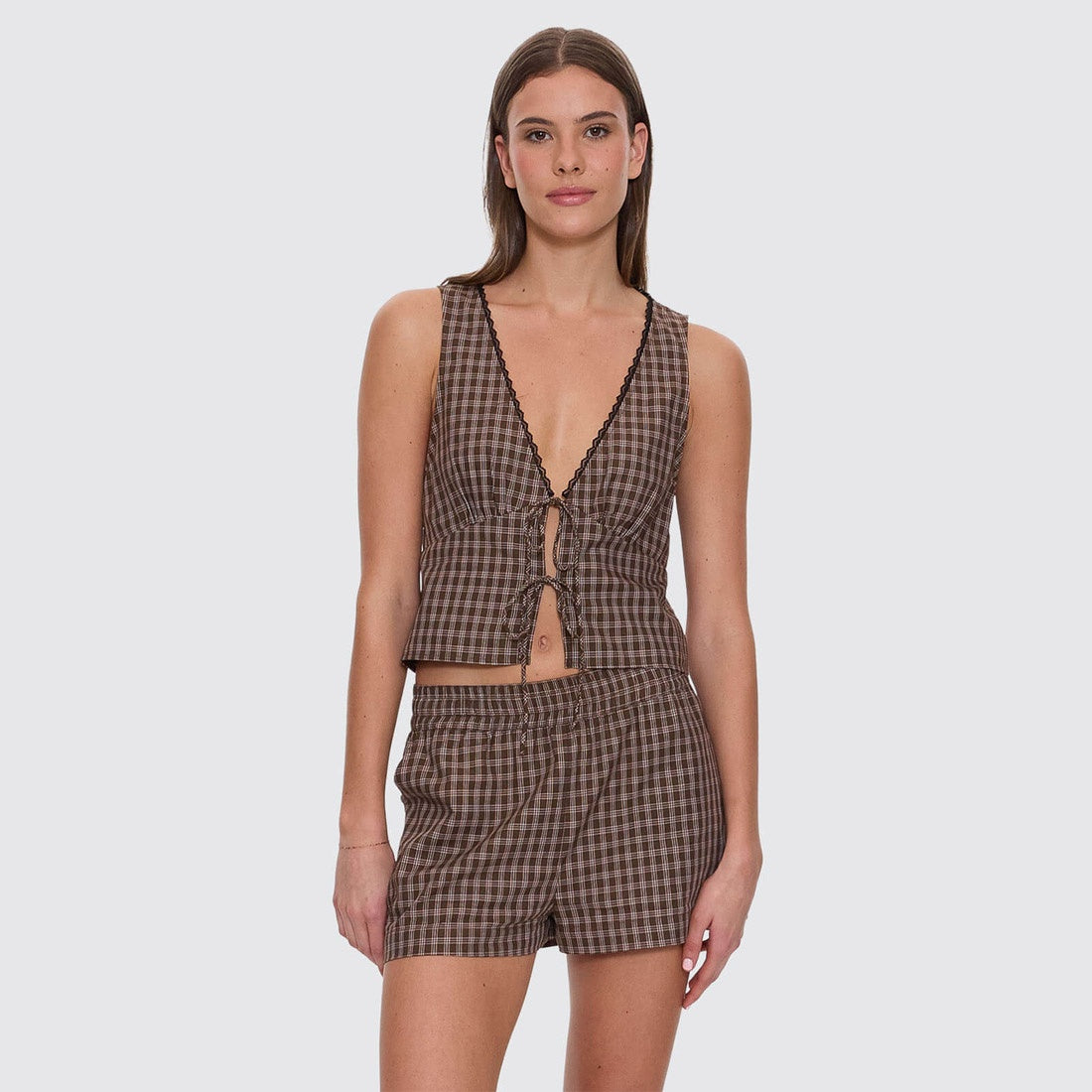 The State Of Mind Check Top in Postal Brown nails throwback charm with a modern edge, featuring a regular fit, deep V neck, and a tie-front that lets you tweak the shape. Cut from yarn-dyed cotton, it feels light and breathable, finished with delicate lace trimming that softens the lines. Wear it with the matching shorts for a coordinated moment, or mix and match with baggy denim and boots for weekend runs. Easy, flattering, and ready to make a statement, this checkered top is a fresh favourite to add to your women's streetwear rotation.