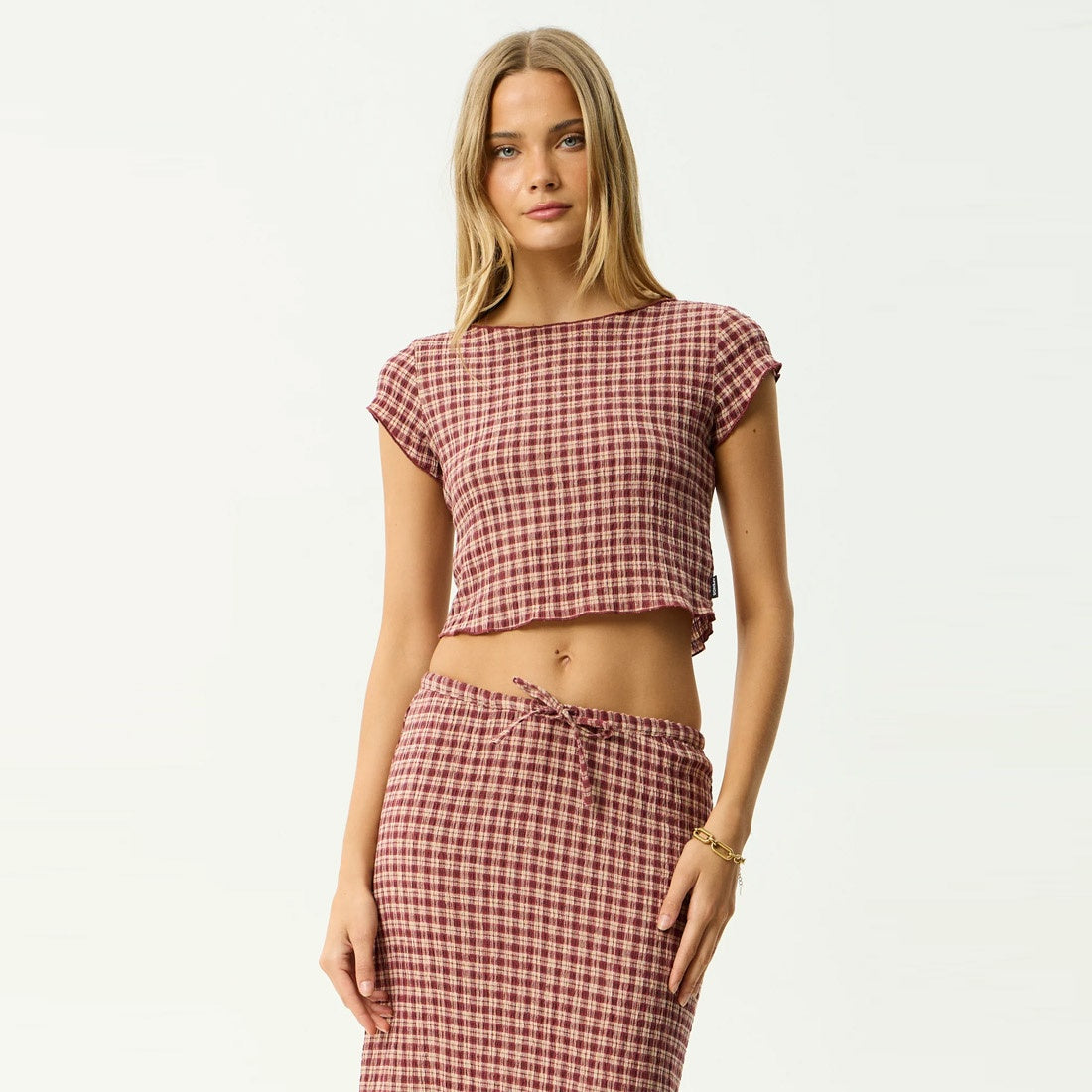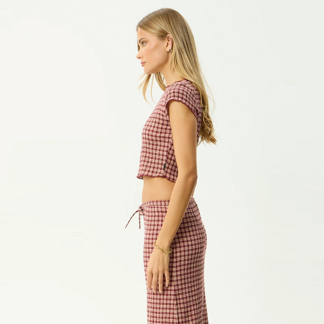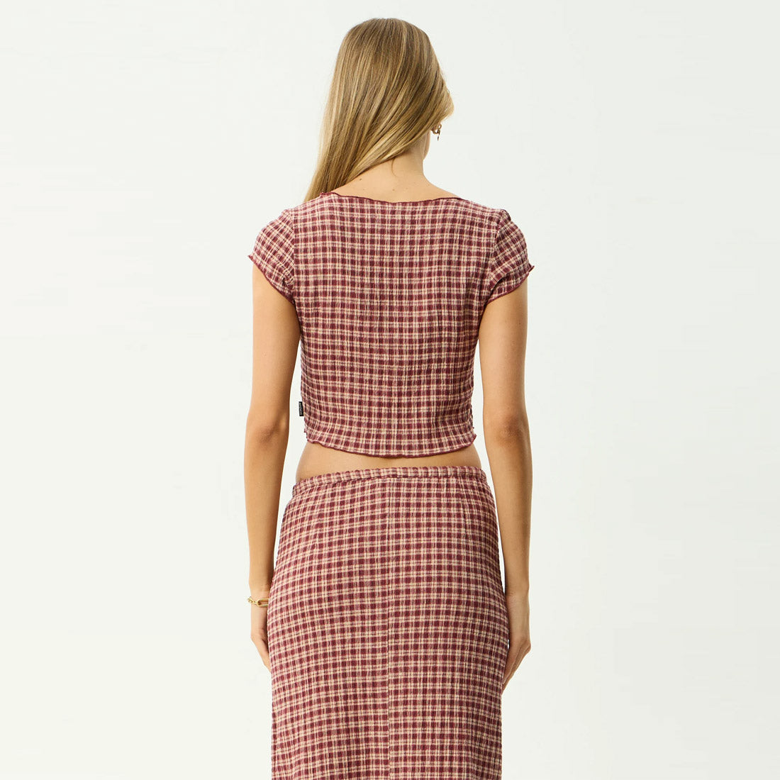 The Capricorn collection is crafted in our in house designed yarn dyed woven check, made from lightweight, breathable hemp and tencel seersucker. Burgundy adds depth, beige keeps it grounded, with a subtle nod to vintage tailoring. This top is designed with a wide boat neckline, cropped length, cap sleeves, and baby lock edges for a clean finish.