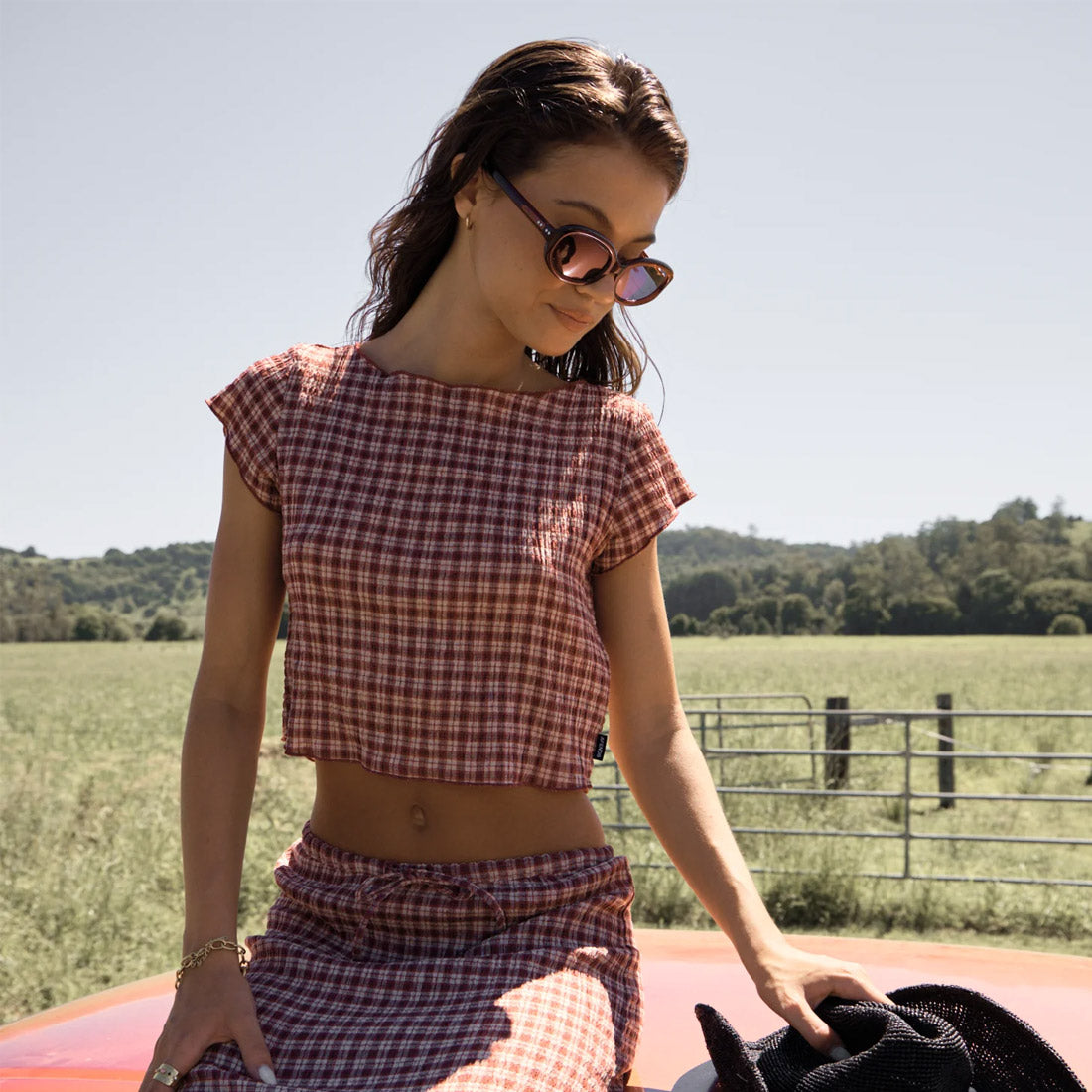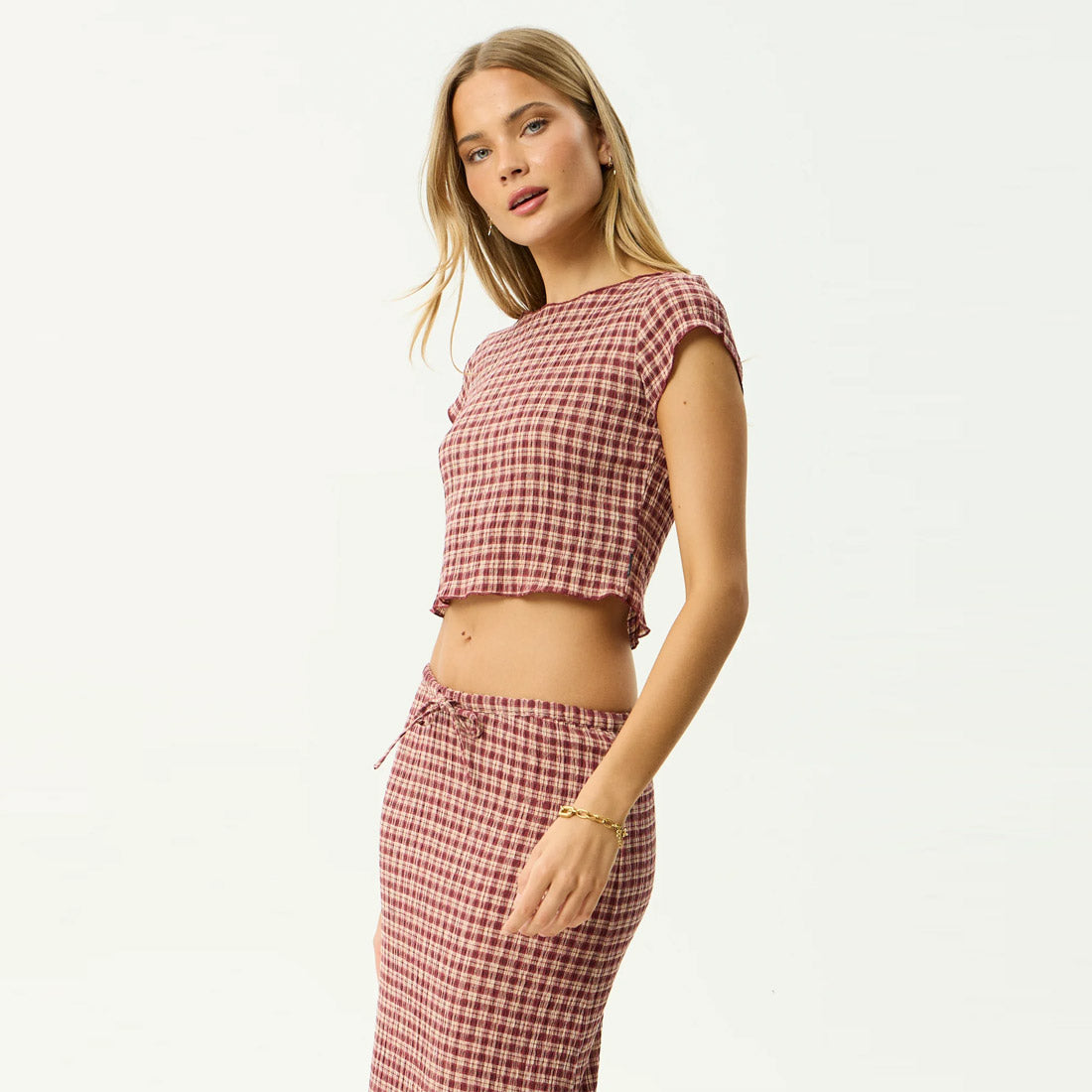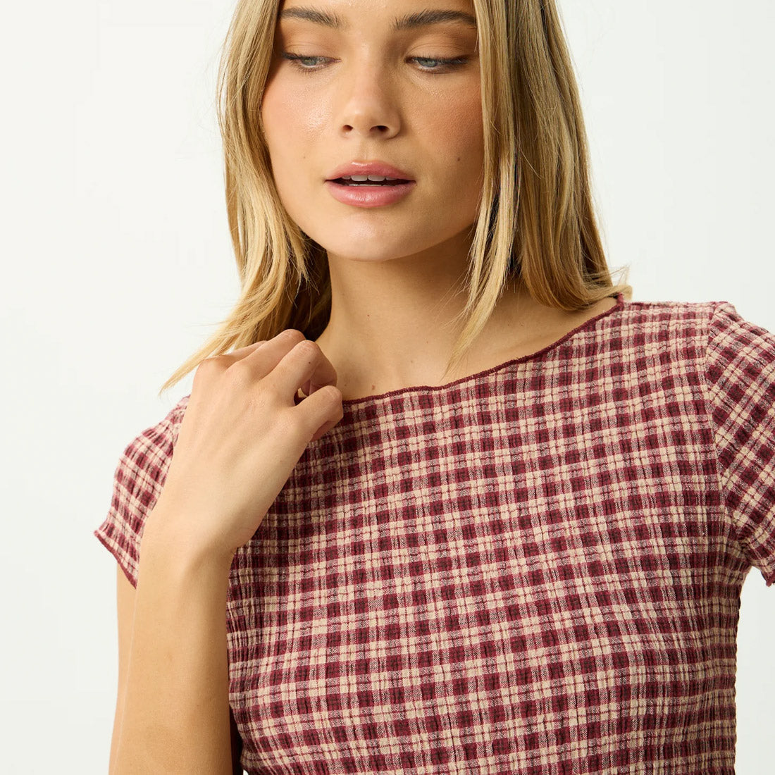 The Capricorn collection is crafted in our in house designed yarn dyed woven check, made from lightweight, breathable hemp and tencel seersucker. Burgundy adds depth, beige keeps it grounded, with a subtle nod to vintage tailoring. This top is designed with a wide boat neckline, cropped length, cap sleeves, and baby lock edges for a clean finish.